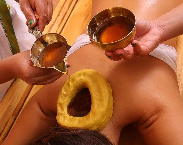 A ring made of black gram dough is placed over the cervical area to form a sealed reservoir. Warm, medicated oil (like Mahanarayana, Ksheerabala, or Vishagarbha taila) is gently poured into the well.
